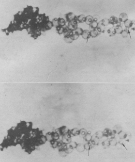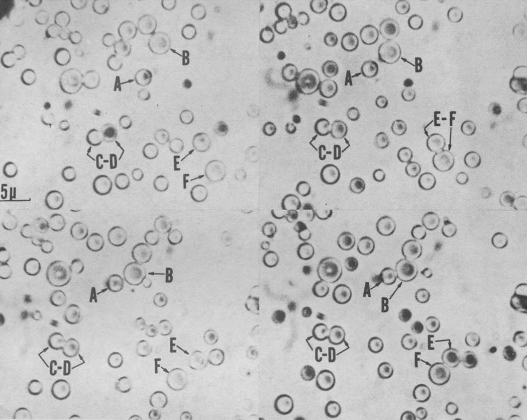 Microesferas de proteinoides de Fox. Movimiento y Comportamiento. En esta imagen podemos observar el “proto-movimiento” y “unión” de diversas microesferas (Pulsar para ampliar). Crédito: Ref. 9