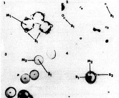 Microesferas de proteinoides de Fox. Reproducción y Crecimiento. (1) Microesferas con un diámetro de 9 μm con algunas yemas (B1); (2) Las yemas (B1) se separan espontáneamente o por vibraciones del medio; (3) Estas nuevas yemas, teñidas (B1), son transferidas a otro medio y crecen (M2), el incremento de color se ve como un halo blanco; (4) Las nuevas microesferas (M2) producen una segunda generación de yemas (B2) (Pulsar para ampliar) Crédito: Ref. 9 y 21