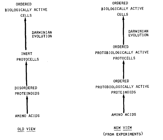 Sidney Walter Fox desde el principio se mostró atraído por los experimentos de Stanley Miller. Pero su campo de interés no se centró en la síntesis de compuestos orgánicos partiendo de moléculas inorgánicas, sino en el paso siguiente, su atención recayó sobre el comportamiento de los aminoácidos ante situaciones que podrían considerarse, calientes (Ref. 20).