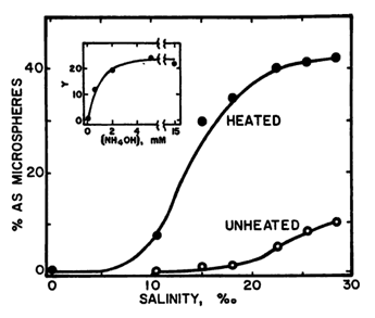Curiosamente se ha descubierto que si incrementamos la salinidad del medio aumenta correlativamente la proporción de proteinoides que se agregan para formar microesferas. Este efecto es bastante importante cuando se emplea sal común (NaCl); y es cuanto menos curioso que este fenómeno alcance su óptimo si la concentración de sal se incrementa hasta asemejarse a la del agua del mar (Ref. 16). ¿Podría trasladarse este modelo a un medio marino?.