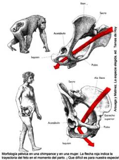 El bipedismo ha afectado hasta el punto de dificultar el parto humano: la nueva disposición de la pelvis, que pasa a soportar verticalmente el peso corporal, produce un canal del parto más largo y sinuoso que el de cualquier otro mamífero, incluyendo al resto de los primates.