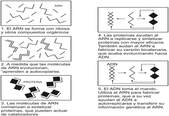 No obstante, tenemos pistas y escenarios muy posibles sobre estas primeras moléculas. Lo más probable es que las primeras moléculas con capacidad catalítica y autorreplicadoran fueran RNAs o análogos donde la ribosa es sustituida por treosa, glicerol, acroleína o eritrol, más estables y energéticamente más económicos de formar que el propio ARN, o incluso otras alternativas como péptidos unidos a bases nitrogenadas que formaran polipéptidos con propiedades de ácidos nucleicos. La selección posterior habría ido favoreciendo aquellos políemeros con mayor cantidad de ribonucleótidos, lo que habría originado un «mundo de ARN». Los análogos del ARN (así como posteriormente el propio ARN) habrían sido capaces de realizar las primeras síntesis proteicas a partir de aminoácidos activados, proteínas que a su vez podrían haber desempeñado una función importante en la selección positiva de los ARN.