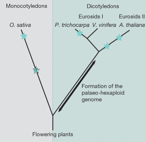Por lo tanto, propusieron una hipótesis: después de que los linajes de monocotiledóneas y dicotiledóneas se separaran (hace 130-240 millones de años), ocurriría una triplicación genética en un pequeño grupo de plantas pertenecientes al linaje de las dicotiledóneas. Estas plantas con el material genético triplicado serían el antepasado común de todas las plantas que hoy conocemos como rósidas (que incluirían al álamo de California, a arabidopsis y a la vid, entre otras muchas especies) (ref. 6).