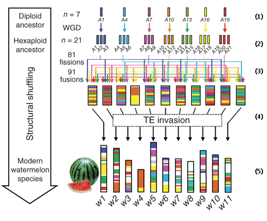 Evolución del genoma de la sandía: (1) genoma diploide ancestral; (2) genoma hexaploide ancestral; (3) reordenamientos genéticos; (4) invasión desvergonzada de transposones; (5) genoma moderno de la sandía. Crédito: (ref. 7).
