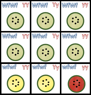 - wfwf YY o wfwf Yy: pulpa amarilla, puesto que tenemos la versión inhabilitada del gen (wf) y porque está presente al menos una versión dominante de (Y), ante la cual la versión no dominante (y) no tiene nada que hacer.