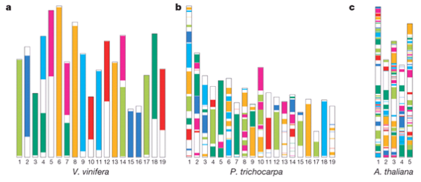Situación de las regiones triplicadas (indicadas con distintos colores) en cada uno de los cromosomas de la vid (a), del álamo de California (b) y de arabidopsis (c). Ya se que no es notoria tal triplicación en el álamo y arabidopsis, pero tened en cuenta que están desordenadas las secuencias en tales especies. Se supone que el genoma de la vid es el más cercano al ancestral. Crédito: (ref. 6).