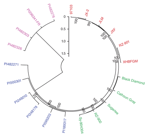Filogenia (parentesco) entre distintos tipos de sandía Citrullus lanatus. El color rosa representa a la subsp. lanatus, el azul a la subsp. mucosospermun, el verde a la subsp. vulgaris cultivada en América y el rojo a la subsp. vulgaris cultivada en el este de Asia. Crédito: (ref. 7).