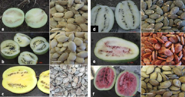 Razas de sandía presentes en Mozambique: (a) y (b) razas productoras de semillas; (c) raza que debe ser cocinada previamente a su consumo; (d) a (f) razas que pueden consumirse crudas, las famosas «sandías dulces del desierto» (más información en los siguientes párrafos). Crédito: (ref. 11).