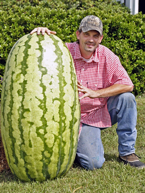 Un tipo posando con su sandía gigante. No creo que sea fotochop, en Estados Unidos hay una asociación especializada en cultivar sandías mu’gordas por las que otorgan premios. Los estadounidenses son así, tienen una extraña obsesión con el tamaño (créd.: GiantWatermelons).