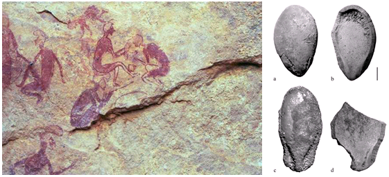 Izquierda, pinturas rupestres de Uan Muhuggiag. Crédito: Mathilda’s Anthropology Blog. Derecha, semillas halladas en Uan Muhuggiag: (a) y (b) vista exterior y corte longitudinal de la semilla de Citrullus colocynthis; (c) y (d) vista exterior y corte longitudinal de una de las semillas de Citrullus lanatus. Crédito: (ref. 13).