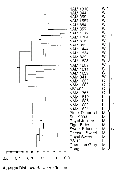 El estudio de Namibia permitió ver que una vez organizados todos aquellos rasgos por “parecido”, generando así un árbol genealógico, las razas de sandías cultivadas para la producción de semillas y aquellas razas que debían cocinarse previamente a su consumo estaban muy relacionadas con las formas silvestres de la planta. Quizás por ello estas razas pueden considerarse como “cultivos primitivos”, es decir, lo más cercano a lo que debieron ser las primeras razas que aparecieron cuando esta planta empezó a ser domesticada. Por su parte, las razas locales que podían consumirse crudas se asociaban con mayor facilidad a las razas comerciales producidas a nivel mundial. Pudo ocurrir que esos rasgos que hacen esas razas locales tan apetecibles para consumirse crudas fueran los mismos rasgos que se seleccionaron tiempo atrás y que originaron las razas cultivadas mundialmente. Asimismo, en dicho estudio no se observó concordancia entre geográfica y parecido, para los autores puede deberse a que la historia de la sandía en la región ha sido muy movida, con introducciones y asilvestramiento de numerosas razas y mestizaje con variedades locales (ref. 10).