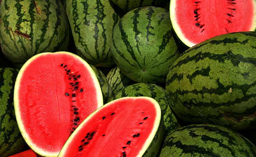 Sandías para todos. Frutos enteros y frutos partidos. Nótese el rojo color característico de nuestras sandías cultivadas. Ganas de sangría aumentando…