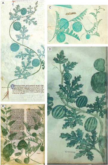 Iconografías medievales (1300 – 1375) de sandías pertenecientes a diversos manuscritos originales de Italia: (a) “Melones palestini ul’ Saracenici” del “Tractatus de herbis”; (b) “Cucumeris” del “Tractatus de herbis, de avibus et piscibus, Manfredus di Monte Imperiali” y (c) “Mellones” del “Tractatus de herbis”. Crédito: (ref. 17).