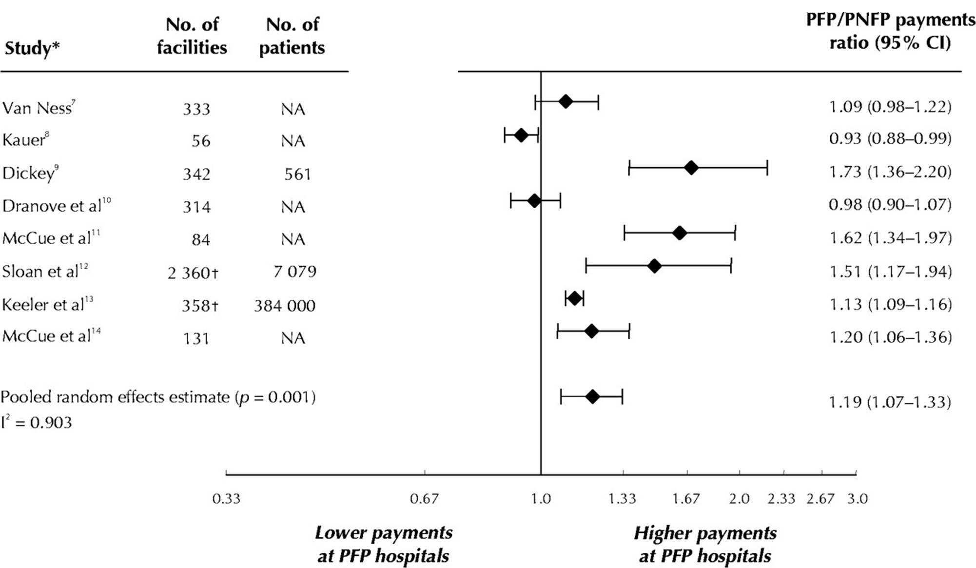 Posteriormente se publicó otro metaanálisis (que incluía cerca de 4.000 hospitales) analizando los costes económicos comparativos de ambos tipos de establecimientos médicos (“for-profit” versus “for-non-profit”). Los resultados tal y como muestra la siguiente figura
