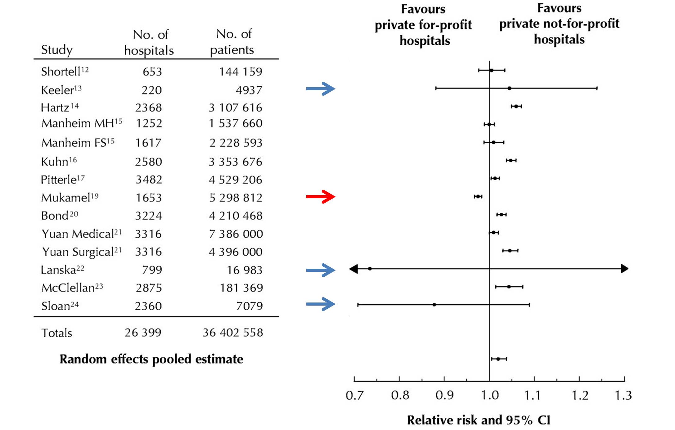 Dejando aparte algunos de los estudios que implicaban a menor número de pacientes (marcados con una flecha azul) por su poca confianza estadística, los datos muestran que sólo hay un estudio (flecha roja) que indique menor mortalidad en hospitales empresariales frente al menos otros 6 que muestran que la mortalidad es inferior cuando no hay ánimo de lucro en la gestión sanitaria. Al final la media poderada en el metaanálisis indicaba que se podía esperar una mortalidad un 2% superior en los hospitales con gestión económica dirigida a la obtención de beneficios que los que realizan su labor sin estas presiones económicas. Además otro estudio de la “Maternal and child health data base” realizado analizando 243 hospitales y más de 1,6 millones de pacientes concluyó que el riesgo de fallecimiento de niños en hospitales orientados a los beneficios empresariales era un 9,5% superior a los gestionados sin ánimo de lucro. Para los que estas cifras les parezcan bajas, indicar que implican la muerte prematura de miles de personas anualmente ligada al sistema neoliberal de obtención de beneficios a toda costa.