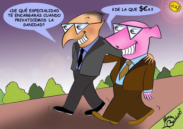 El caso de sanidad pública con gestión privada, es el peor. La sanidad es pública, y la gestión privada, con lo que es más difícil encontrar responsables de nada. El dinero público sale de la administración en grandes paquetes y es más fácil fomentar la corrupción del político que puede recibir mucho dinero en «negro» que el hospital genera con facturas falsas. Se convierte en una agencia de colocaciones de partidos varios, ya que la empresa gestora debe de tener contento al político de turno para que cuando diga que no le salen las cuentas pueda pagar los sobrecostes sin rechistar. La gestión mixta de lo público es un cáncer que amenaza con destruir el tejido de las prestaciones sociales. Del mismo modo que las empresas forzaron a algunos trabajadores a darse de alta en régimen autónomo para permitirles seguir trabajando en la misma empresa apareciendo al imagen del falso autónomo, hoy existen empresas de servicios que sólo trabajan para la administración siendo esa la imagen de la «falsa empresa», que vive del sobrecoste de los servicios públicos aferrada a ellos como una garrapata.