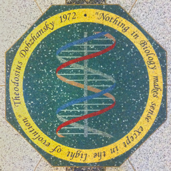Medallón del mosaico del suelo del Jordan Hall of Science de la Universidad de Notre Dame. Se cita la famosa frase de Theodosius Dobzhansky (1900-1975) «Nada en biología tiene sentido excepto a la luz de la evolución«. Crédito: wikipedia